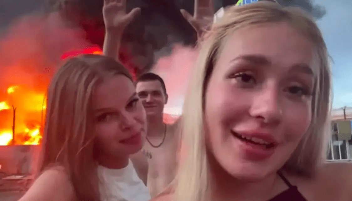 Two women, identified as 21-year-old Darya and 19-year-old Karina, alongside an unidentified male, have been arrested after filming a social media video earlier today in front of a burning oil depot in Adler, Southwestern Russia, which was targeted last night in a large-scale… pic.twitter.com/R8xr0xyqdu