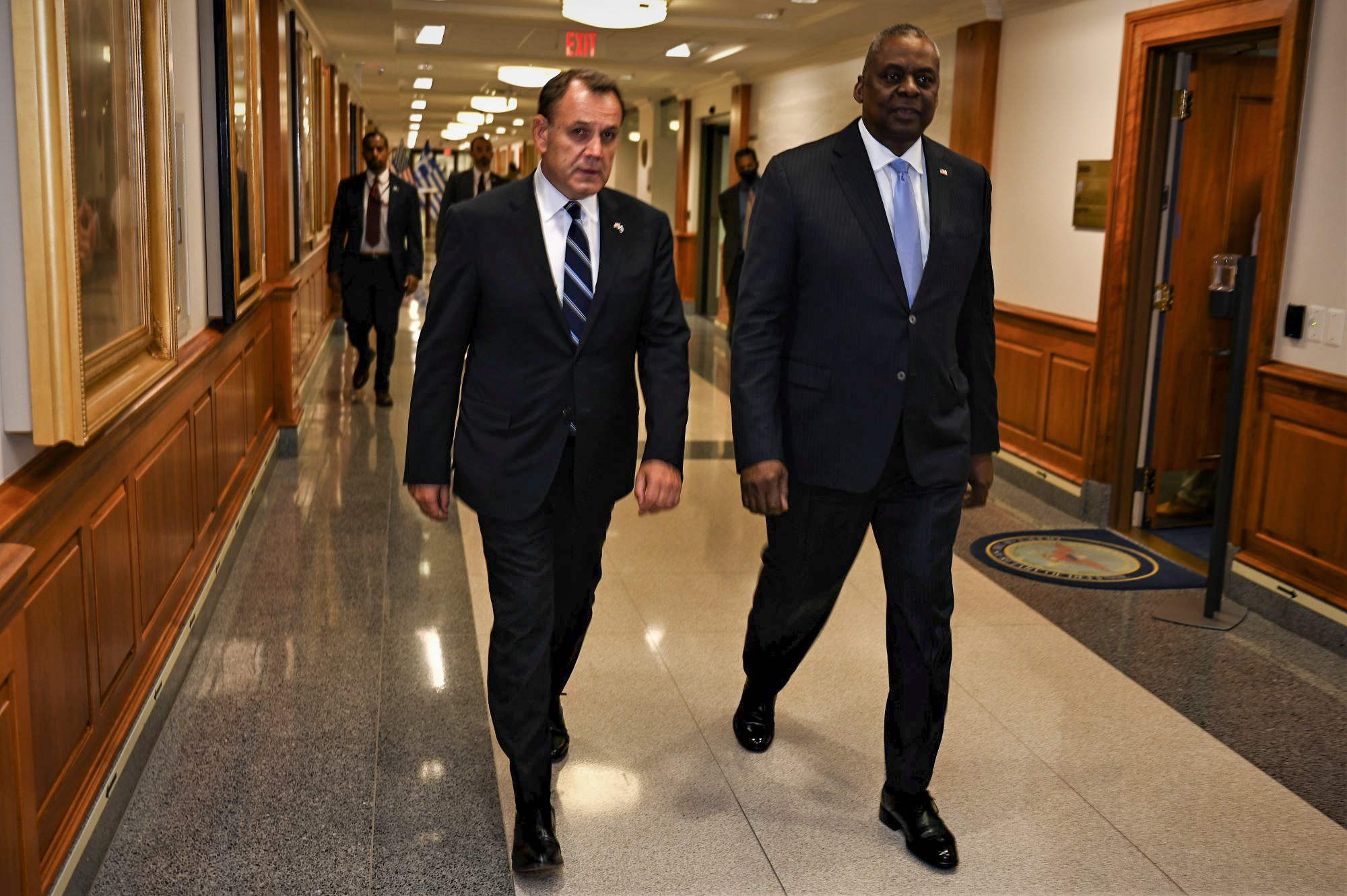 ΝΙΚΟΛΑΟΣ ΠΑΝΑΓΙΩΤΟΠΟΥΛΟΣ: «Κύριε Υπουργέ, αγαπητέ Λόιντ, είναι ιδιαίτερη η χαρά μου να σε συναντώ σήμερα εδώ στην Ουάσιγκτον. Αποτελεί πραγματική τιμή να επισκέπτομαι το Πεντάγωνο. Οπότε επίτρεψέ μου κατ’ αρχάς να τονίσω με τη σειρά μου τη σημασία μιας ισχυρής, σε βάθος και διαρκώς διευρυνόμενης στρατηγικής αμυντικής συνεργασίας μεταξύ των Ηνωμένων Πολιτειών και της Ελλάδας, μιας συνεργασίας που έχει φτάσει στο υψηλότερο σημείο της ιστορίας της τα τελευταία χρόνια μετά τις δύο επικαιροποιήσεις της συμφωνίας αμοιβαίας αμυντικής συνεργασίας το 2019 και πέρυσι. Το εξαιρετικό επίπεδο της αμυντικής συνεργασίας Ελλάδας – ΗΠΑ, σε συνδυασμό με συνεκπαιδεύσεις και κοινές ασκήσεις που αυξάνουν τη διαλειτουργικότητα, καθώς και τη διευρυμένη παρουσία στρατιωτικών δυνάμεων των ΗΠΑ σε νέες περιοχές και στρατηγικά σημεία της ελληνικής επικράτειας, όπως ανέφερες, αποτελεί απόδειξη της κοινής μας θέλησης και επιθυμίας να αυξήσουμε την ετοιμότητά μας προκειμένου να αντιμετωπίσουμε τις κοινές απειλές και προκλήσεις και να προστατέψουμε τα συμφέροντά μας στην ευρύτερη περιοχή, η οποία αποτελεί περιοχή ιδιαίτερης γεωπολιτικής σημασίας.