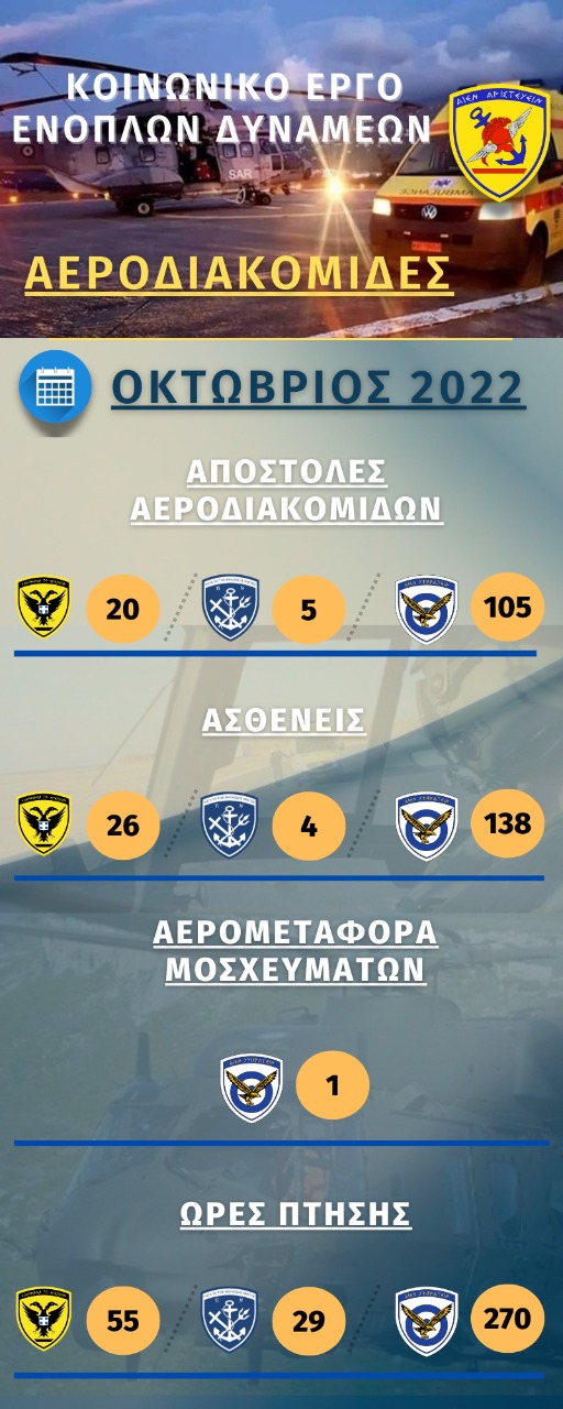 Οι Ένοπλες Δυνάμεις στο πλαίσιο της κοινωνικής τους προσφοράς, πραγματοποίησαν σύνολο 130 αεροδιακομιδές και μετέφεραν 168 ασθενείς.