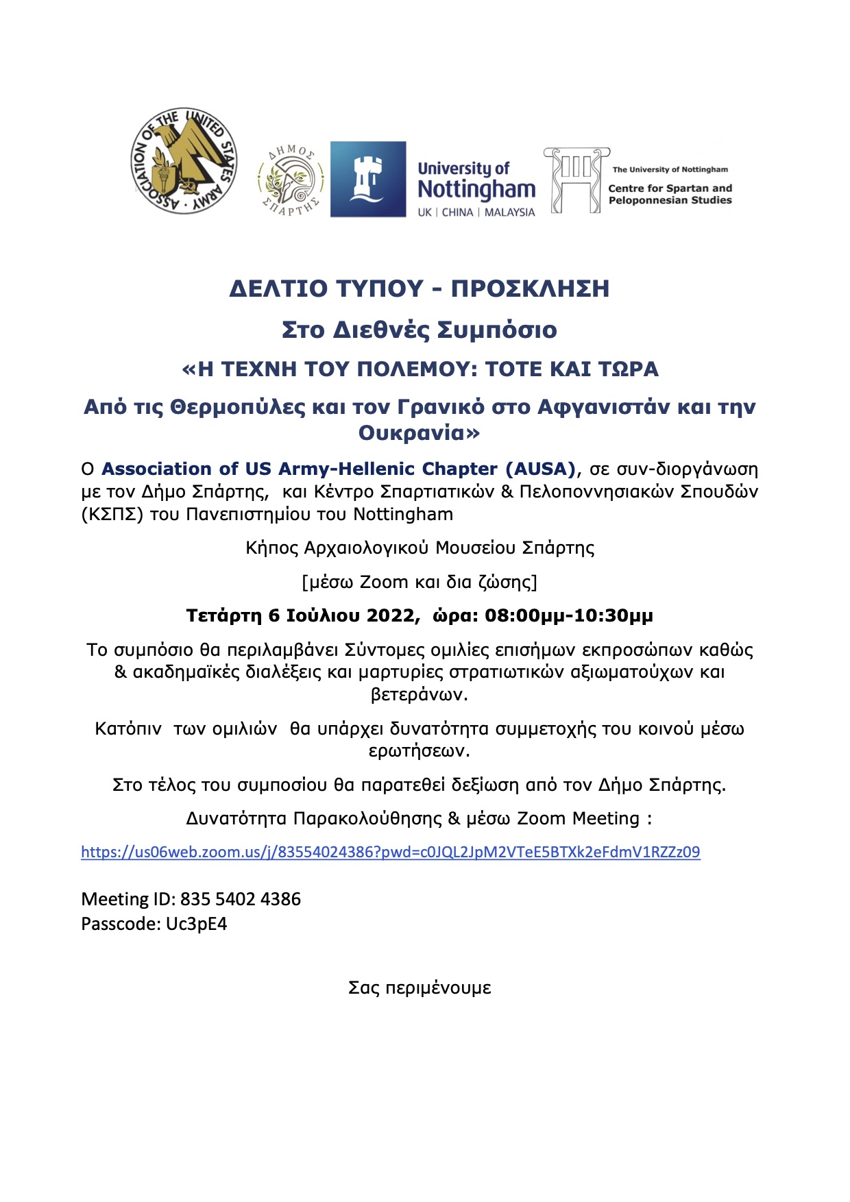 Η μελέτη του αιώνιου αυτού προβλήματος θα παρουσιαστεί μέσα από εμπεριστατωμένες ακαδημαϊκές ομιλίες και μαρτυρίες βετεράνων πολέμου στο Διεθνές Συμπόσιο που διοργανώνει ο Δήμος Σπάρτης, το Νομικό Πρόσωπο Πολιτισμού & Περιβάλλοντος του Δήμου Σπάρτης, το Ελληνικό Παράρτημα της Ένωσης US Army-Hellenic Chapter (AUSA) και το Κέντρο Σπαρτιατικών & Πελοποννησιακών Σπουδών (ΚΣΠΣ) του Πανεπιστημίου του Nottingham, με θέμα: «Η Τέχνη του Πολέμου: Τότε και τώρα. Από τις Θερμοπύλες και τον Γρανικό στο Αφγανιστάν και την Ουκρανία».