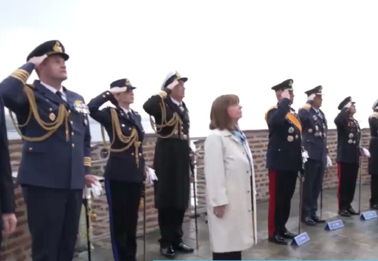 Στην τελετή έπαρσης της σημαίας στην κορυφή του Λευκού Πύργου στη Θεσσαλονίκη παρέστη η Πρόεδρος της Δημοκρατίας, Κατερίνα Σακελλαροπούλου, ανήμερα του εορτασμού του πολιούχου Αγίου Δημητρίου και της επετείου απελευθέρωσης της πόλης.