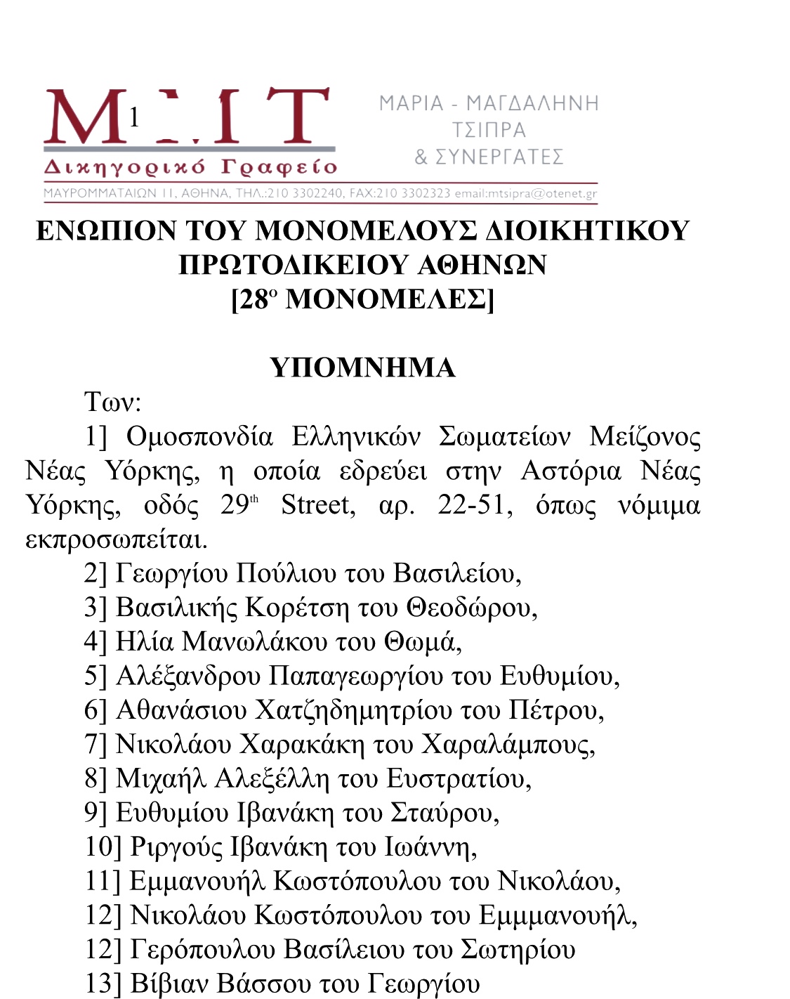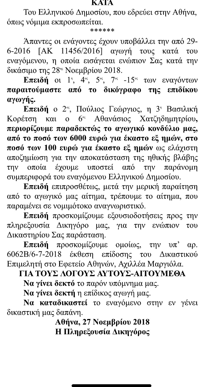 Κατατέθηκε υπόμνημα της δικηγόρου κυρίας Μαρίας- Μαγδαληνής Τσίπρα με συμβολικό ποσό αποζημίωσης των 100 ΕΥΡΩ έναντι του αρχικού των 6.000 ΕΥΡΩ