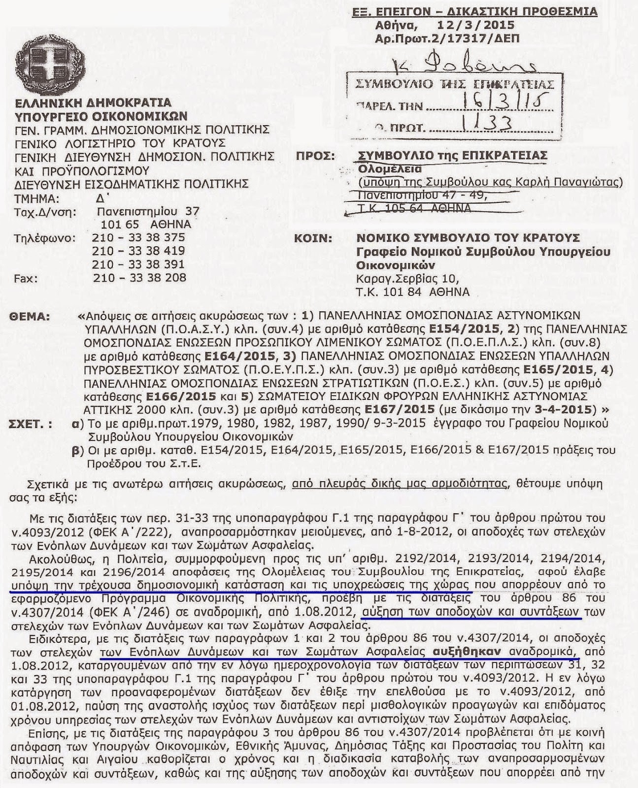 Μεταξύ των άλλων αναγράφεται στην υπόψη επιστολή: «… η Πολιτεία συμμορφούμενη με τις υπ΄ αριθμ. 2192,3,4,5/2014 αποφάσεις της Ολομέλειας του ΣτΕ, αφού έλαβε υπόψη την τρέχουσα δημοσιονομική κατάσταση και τις υποχρεώσεις της χώρας που απορρέουν από το εφαρμοζόμενο Πρόγραμμα Οικονομικής Πολιτικής, προέβη με τις διατάξεις του άρθρου 86 του ν.4307/2014 (ΦΕΚ Α΄/246) σε αναδρομική, από 1.08.2012, αύξηση των αποδοχών και συντάξεων των στελεχών των Ενόπλων Δυνάμεων και των Σωμάτων Αασφαλείας.»