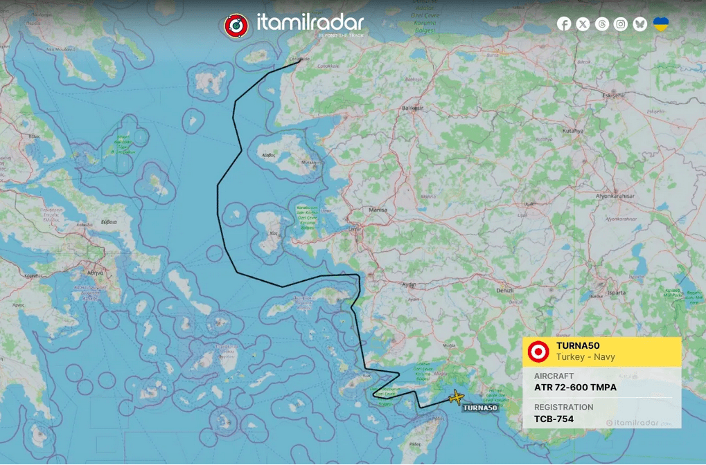 Ένα αεροσκάφος θαλάσσιας περιπολίας ATR 72 του Τουρκικού Ναυτικού (reg. TCB-754 – c/s TURNA50) πραγματοποίησε μια αποστολή μεγάλης εμβέλειας πάνω από το Αιγαίο Πέλαγος, επιχειρώντας εντός του FIR Αθηνών, αποφεύγοντας προσεκτικά την είσοδο στον ελληνικό εθνικό εναέριο χώρο.